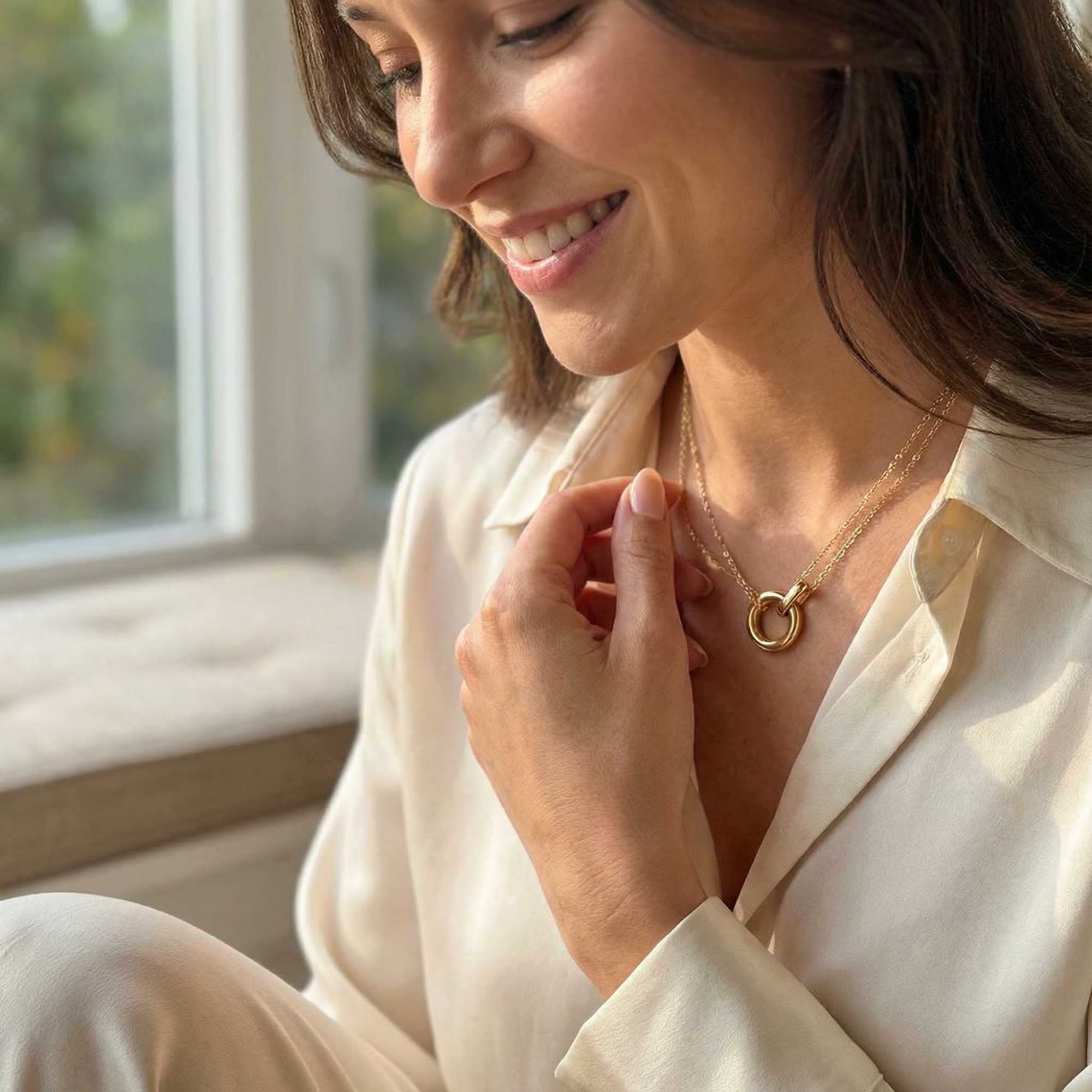 This elegant double-layer necklace features an interlocking circle pendant that symbolizes eternal bonds and unbreakable connections. Two delicate gold chains create beautiful dimension, while the sculptural circle charm adds meaningful sophistication to any neckline.